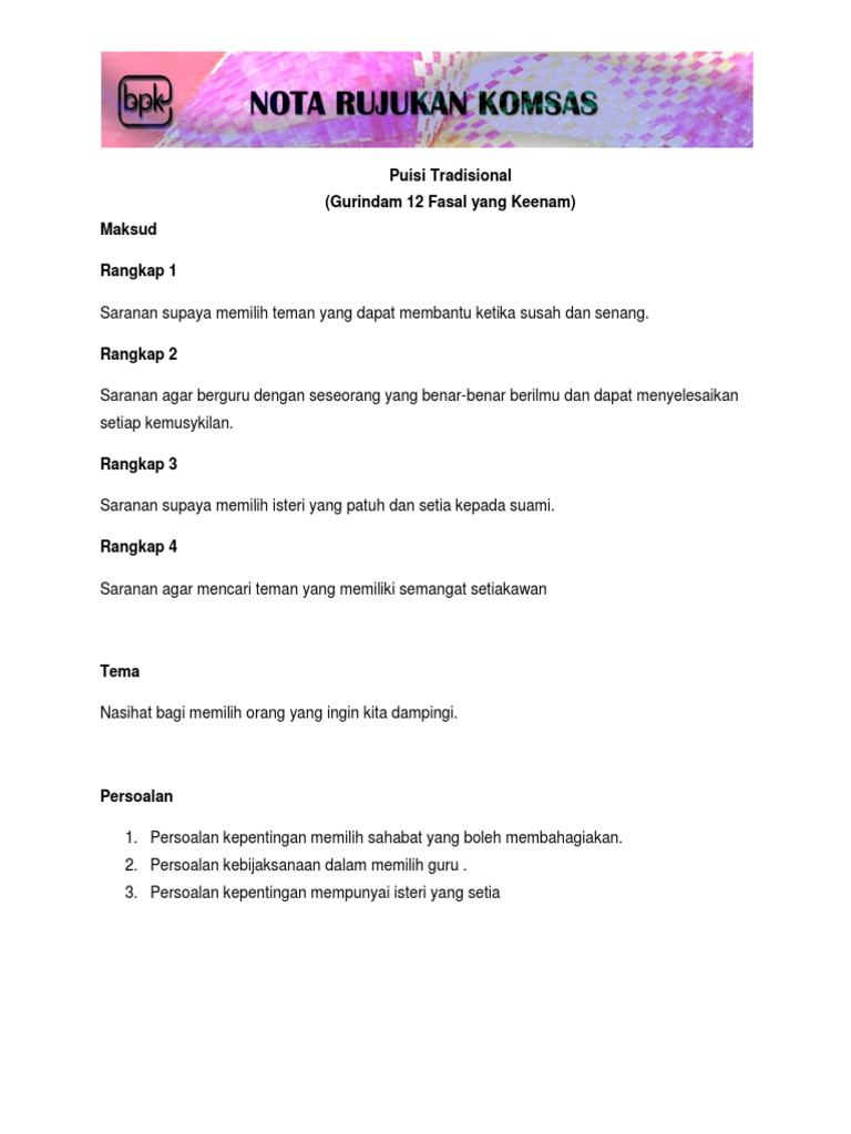 Nota komsas gurindam 12 fasal yang keenam 3 03 12. Gurindam ini memberi nasihat supaya memelihara anggota diri dan berbudi pekerti. Maksud nilai pengajaran maksud. Unknown 8 october 2018 at 12 57.
