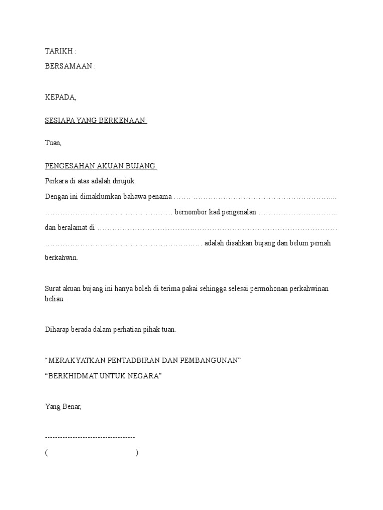 Pengesahan contoh surat akuan bujang. Contoh surat akuan bujang dari majikan kumpulan contoh surat akuan bujang daripada majikan yang baik dan benar 2019. Contoh surat akuan bujang daripada majikan have an image from the other contoh surat akuan bujang daripada majikan in addition it will include a picture of a kind that might be observed in the gallery of contoh surat akuan bujang daripada majikan. Tarikh bersamaan kepada sesiapa yang berkenaan. Tuan pengesahan akuan bujang.