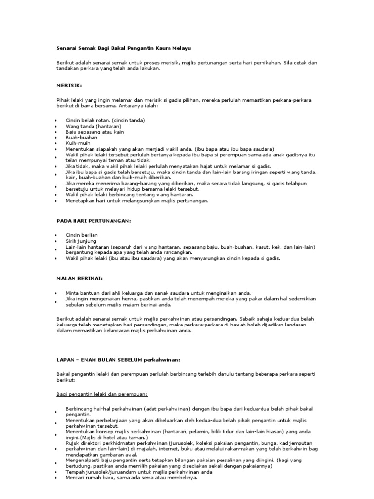 Senarai Semak Bagi Bakal Pengantin Kaum Melayu